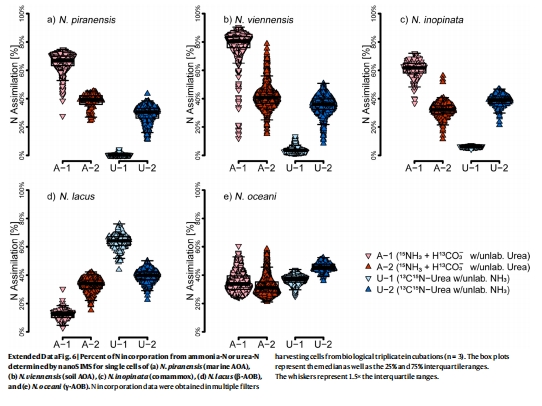 AOA(N. piranensis, N. viennensis)和comammox(N. inopinata)先耗盡氨后才利用尿素(存在雙峰生長)。