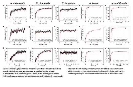 數據:微呼吸儀(Unisense電極)測定氨/尿素氧化的米氏常數(Km(app))和比親和力(a°)。