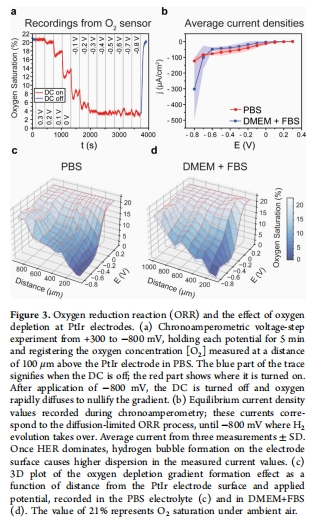 首次直接繪制PtIr電極附近的O?消耗梯度(圖3c,d):在-400 mV時,距電極100 μm處[O?]降至3%(vs. 21%飽和值),證實電化學脫氧可創(chuàng)造局部缺氧微環(huán)境(影響細胞行為)。