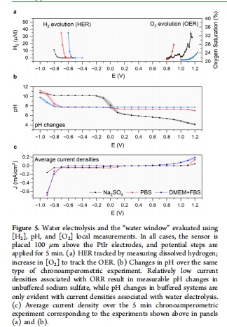 局部pH實時變化(圖5b):直接關聯HER與堿化(ΔpH≈3)、OER與酸化,但培養(yǎng)基中因有機緩沖無顯著變化,解釋生物環(huán)境中pH穩(wěn)定性。
