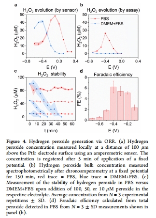 ORR:從+300 mV開始,造成局部缺氧(圖3),生成H?O?(PBS中FE<5%,圖4d)。