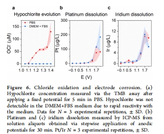 氯氧化與溶解:>1.1 V時生成OCl?(圖6a)和可溶性Pt/Ir離子(圖6b,c),潛在細胞毒性。