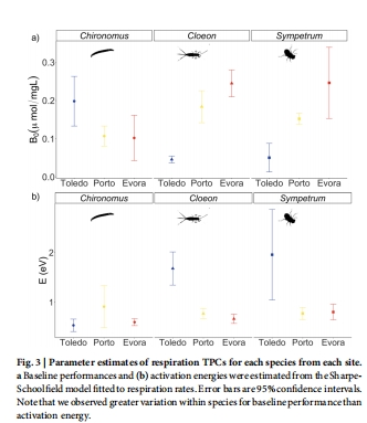 蜻蜓(S. striolatum)和蜉蝣(C. dipterum)在溫暖位點上調代謝(B0升高;圖3a),運動能力增強。