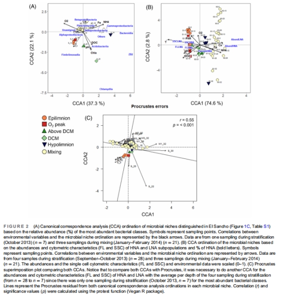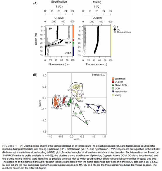 方法:在西班牙酸性水庫(El Sancho,pH 3.5–4.5)的分層期(stratification)和混合期(mixing),同步分析浮游細菌的分類組成、豐度及單細胞特征。