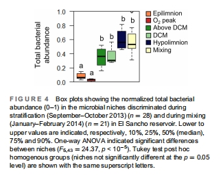 識別水庫水柱在分層期和混合期的微生物生態位。