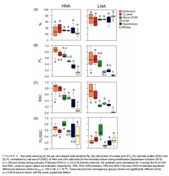 HNA/LNA比例穩定(~30%/70%),但絕對豐度和單細胞特征因生態位而異(圖4, 5)。