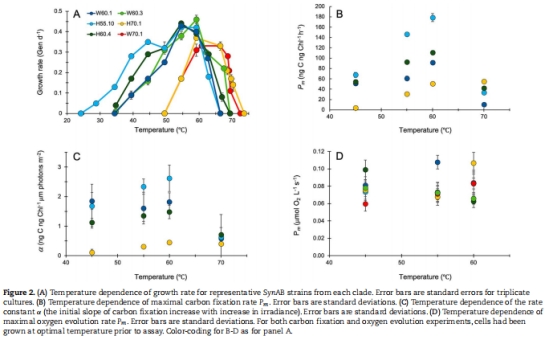 與碳固定數據(Fig. 2B, C)對比:高溫菌株碳固定能力顯著下降,但放氧能力穩定。