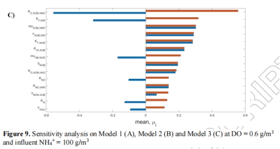 敏感性參數(shù)排名 圖9, 表S8 識(shí)別KO.AOB.AMO(氨單加氧酶氧親和力)為最敏感參數(shù),與傳質(zhì)模型無(wú)關(guān)。