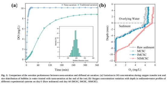 直接證明納米氣泡穿透沉積物能力:納米氣泡(平均直徑184.12 nm)因高拉普拉斯壓力快速溶解釋氧,突破傳統曝氣無法氧化深層沉積物的限制。