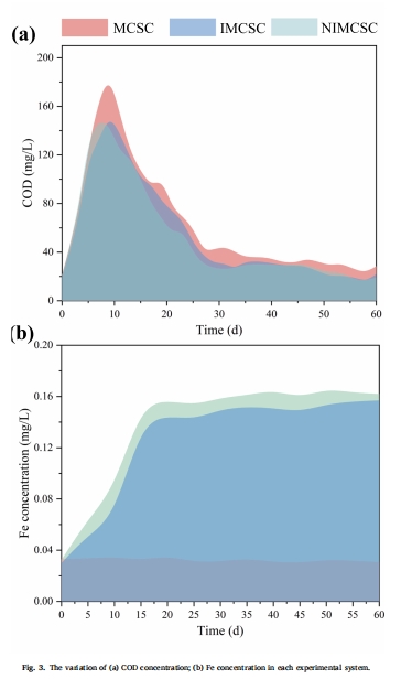 IMCSC/NIMCSC的COD穩定在17–19 mg/L(達標排放),Fe2?緩釋(0.126–0.137 mg/L)提供電子供體。