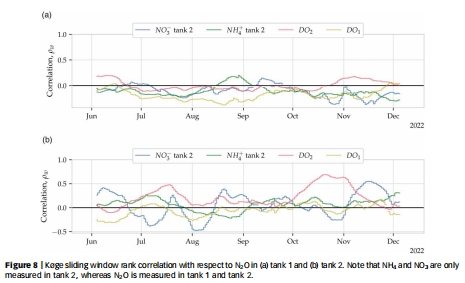 滑動(dòng)窗口秩相關(guān)(窗口=30天),分析N?O與NH?/NO?/DO的時(shí)變關(guān)系(圖5–8)。