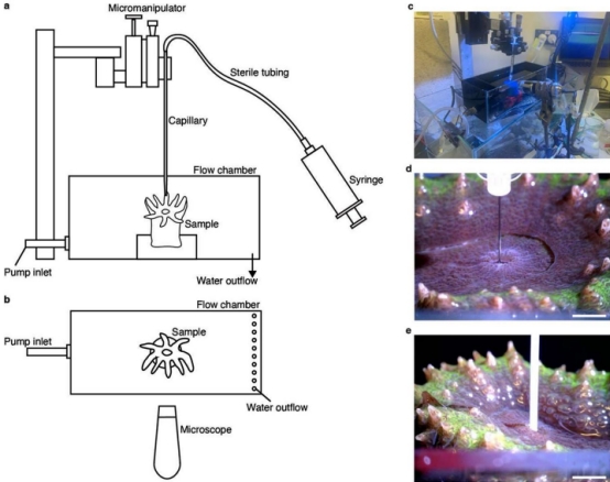 (d)(e)為實際操作場景,顯示珊瑚口部插入采樣工具的過程。