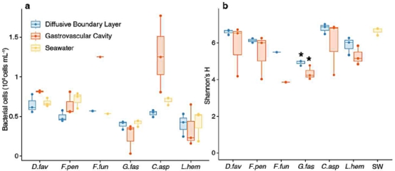 (b)G.fascicularis的GVC多樣性顯著低于海水,反映微生境選擇性。
