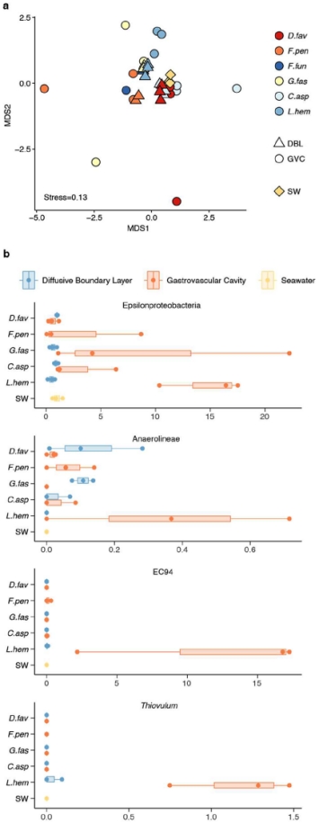 核心微生物組成 圖4b, 圖6a 鑒定跨環(huán)境穩(wěn)定核心類群(如Campylobacterales, EC94),支持GVC微生物非隨機定植,可能具有功能共生關系。