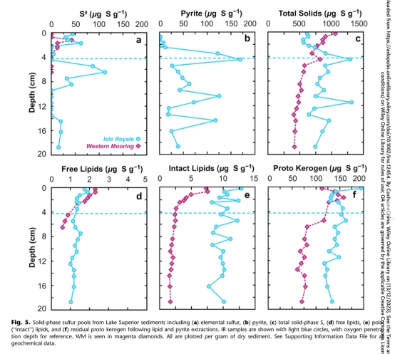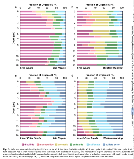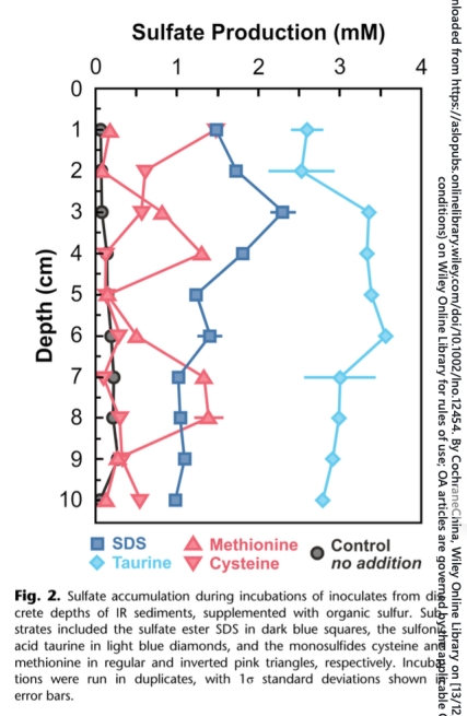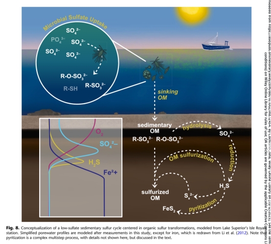 摘要指出:有機(jī)硫在低硫酸鹽環(huán)境(如淡水湖和古海洋)沉積物的生物地球化學(xué)循環(huán)中至關(guān)重要。本研究以硫酸鹽貧乏(<40μM)、富鐵(30-80μM)的蘇必利爾湖沉積物為對(duì)象,追蹤有機(jī)硫從來源到歸宿的全過程。通過宏基因組測序識(shí)別微生物群落,結(jié)合孔隙水和固相地球化學(xué)分析,發(fā)現(xiàn)沉積物中活躍的硫循環(huán)主要由氧化態(tài)有機(jī)硫驅(qū)動(dòng)。沉積物培養(yǎng)實(shí)驗(yàn)證實(shí)微生物能水解磺酸鹽、硫酸酯和磺酸產(chǎn)生硫酸鹽;硫酸鹽還原基因(dsrAB)豐度隨深度增加并與硫化物峰值吻合。盡管存在硫化物生成跡象,但由于黃鐵礦化和有機(jī)質(zhì)硫化作用,硫化物濃度保持低位(<40 nM)。在氧化還原界面下方,黃鐵礦占沉積物總硫的13%,同時(shí)該層段游離脂質(zhì)和完整脂質(zhì)中二硫化物積累,表明低硫濃度下硫化作用仍快速發(fā)生。這一模型揭示了有機(jī)硫在低硫酸鹽環(huán)境中既作為硫酸鹽還原的燃料,又消耗其產(chǎn)物的雙重角色。