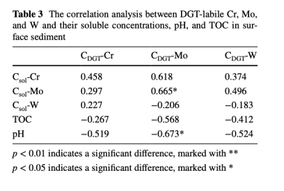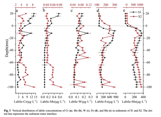 Cr、Mo、W的遷移受鐵錳氧化物還原溶解控制:DGT有效態濃度與Fe/Mn顯著正相關(圖5a-f),且還原層(-12mm)出現同步峰值(圖3)