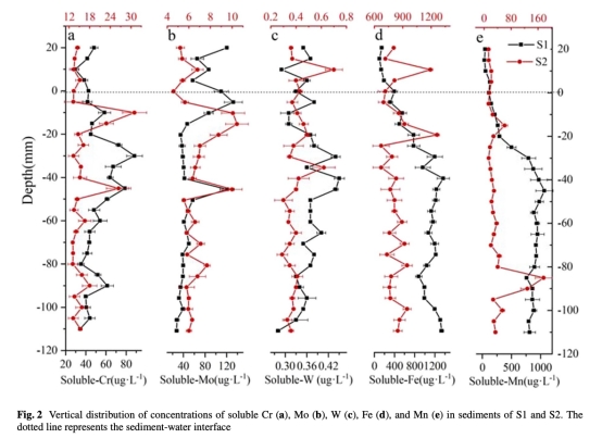 酸化驅動的金屬活化:電極測得沉積物還原層pH降低(研究未直接展示數據但文本提及),與Cr/Mo/W有效態濃度升高(圖3)及Fe/Mn還原溶解(圖2d-e)空間匹配,證實酸化促進金屬從氧化物表面解吸