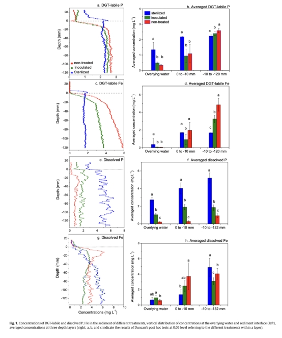 微生物對磷滯留的關(guān)鍵作用:滅菌顯著降低沉積物固磷能力(DGT-labile P在0-10mm層升高,圖1a-b),而接種微生物可部分恢復(fù)該能力。
