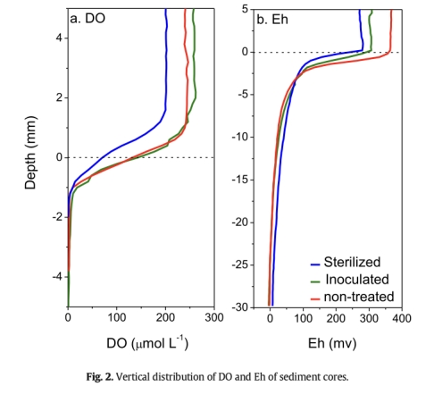 數(shù)據(jù)顯示自然組和接種組Eh(+100至+200 mV)顯著高于滅菌組(-50至0 mV),DO滲透深度更深(自然組3.8mm vs 滅菌組2mm)。