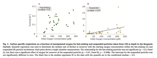 數據:懸浮顆粒呼吸速率隨氧氣降低線性下降(y=0.008x, p=0.01),本格拉寒流20μM O?時呼吸降低7倍。