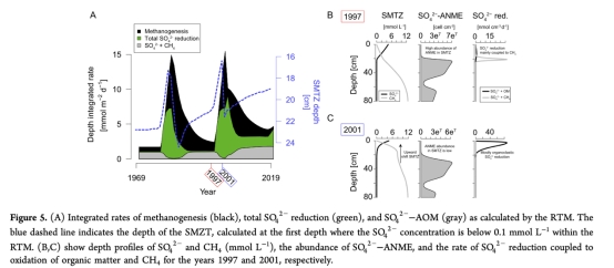 多途徑氧化貢獻(xiàn):鐵/錳氧化物介導(dǎo)的厭氧甲烷氧化(Fe/Mn-AOM)占總氧化的10%,其余由O?(表層)和SO?2?(硫酸鹽還原帶,SMTZ)主導(dǎo)(圖3D)。