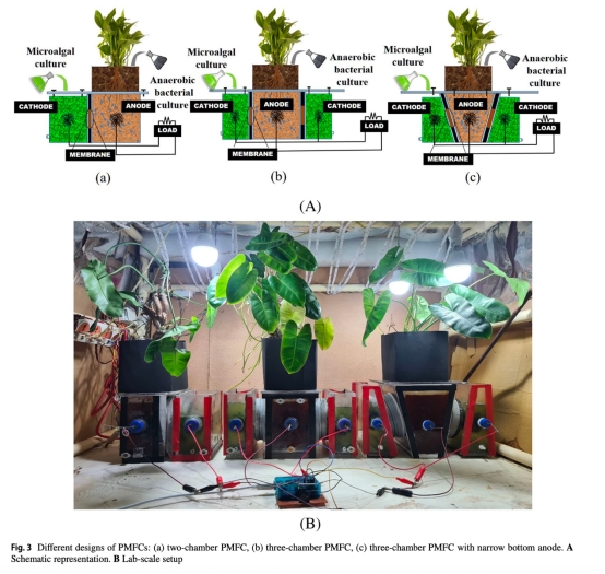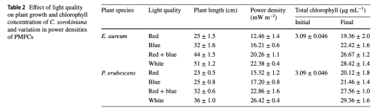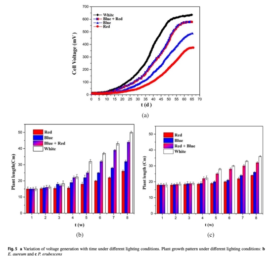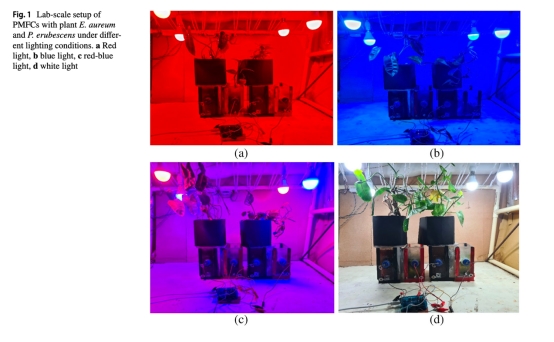 數(shù)據(jù):窄底三室PMFC功率密度31.40 mW/m2,較雙室提升39.6%;白光下紅掌PMFC功率26.42 mW/m2,較紅光高72%。