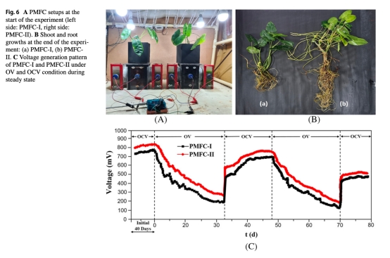 新型生長(zhǎng)介質(zhì)(含海藻提取物、氨基酸、植物激素等)使植物根系生物量增加,功率提升31%至27.41 mW/m2(圖6);