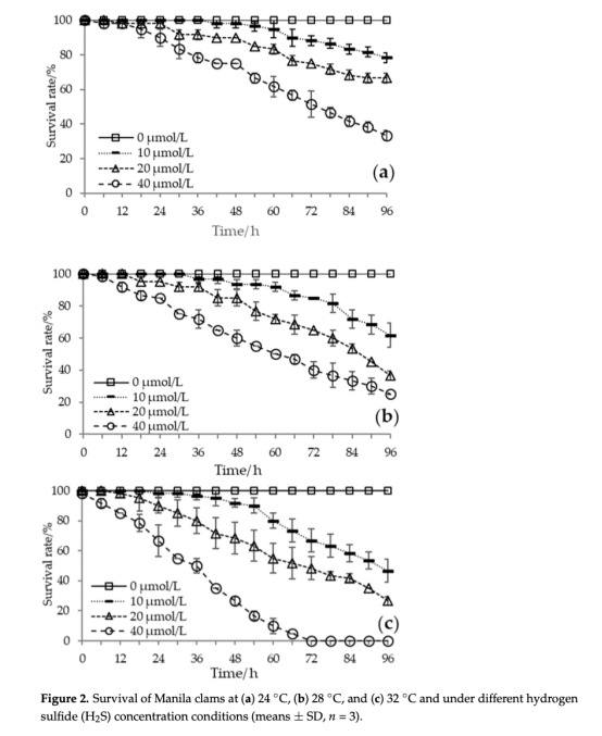 協同效應:高溫(32°C)使H?S半致死時間(LT??)縮短50%以上,表明溫度升高顯著降低蛤類對H?S的耐受閾值。