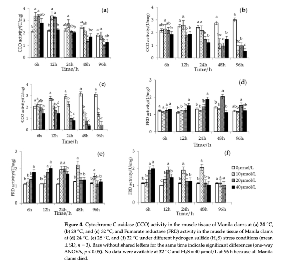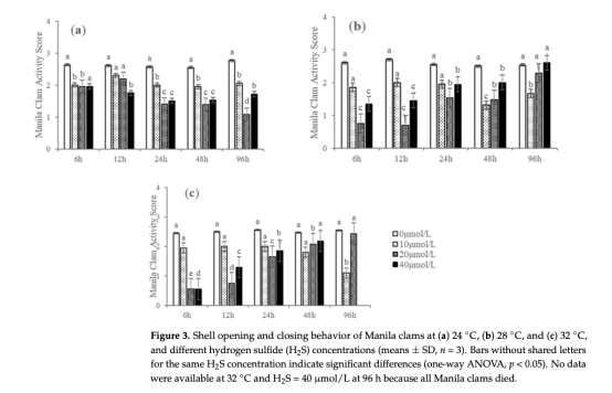 行為防御:低溫(24°C)或低H?S濃度(≤10 μmol/L)下,蛤類初期通過開殼增強攝氧(行為評分升高);隨脅迫時間延長轉為閉殼被動防御。高溫(≥28°C)與高H?S(≥20 μmol/L)協同脅迫時,蛤類立即閉殼。