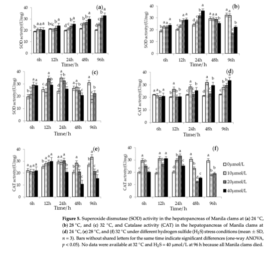 SOD/CAT(圖5):高溫(32°C)+高H?S(40 μmol/L)導致抗氧化酶活性早期峰值后快速衰退,反映氧化損傷失控。
