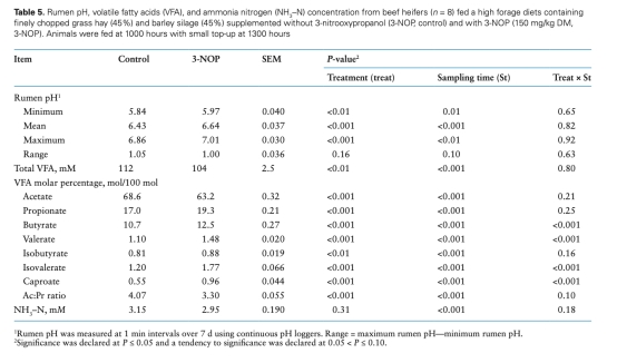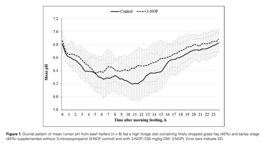研究評估了在高纖維日糧(90%牧草干物質(zhì)基礎(chǔ))中添加甲烷抑制劑3-硝基氧丙醇(3-NOP,150 mg/kg干物質(zhì))對肉牛的影響: