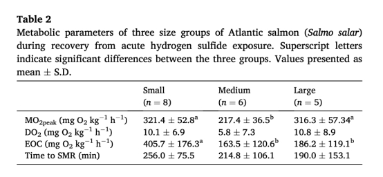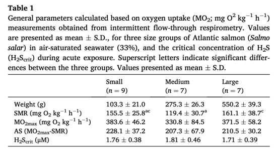所有組平均H?Scrit為1.78±0.39 μM(60.7±13.2 μg/L),無(wú)體型差異(P=0.786)。意義:首次明確大西洋鮭H?S耐受閾值遠(yuǎn)低于既往報(bào)道(如金魚3.5 μM),解釋養(yǎng)殖中突發(fā)死亡現(xiàn)象。