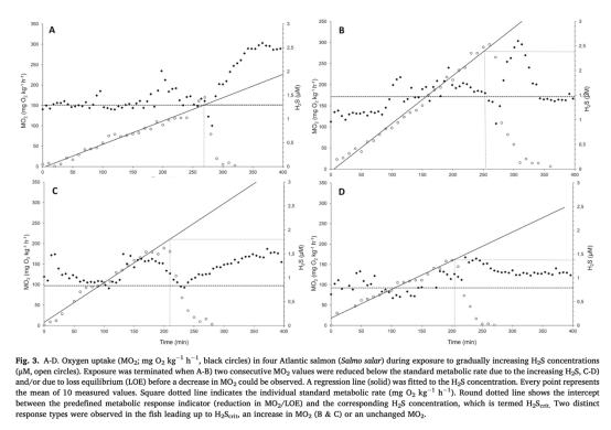 研究通過(guò)間歇性流通式呼吸測(cè)量法,評(píng)估了急性硫化氫(H?S)暴露對(duì)大西洋鮭代謝的影響。實(shí)驗(yàn)將三組不同體重(100-500克)的鮭魚暴露于漸進(jìn)增加的H?S濃度(0.53±0.14 μM/h),直至耗氧率(MO?)低于標(biāo)準(zhǔn)代謝率(SMR)或失去平衡(LOE),此時(shí)定義為臨界H?S濃度(H?Scrit)。暴露后,魚類在無(wú)H?S水中恢復(fù),以測(cè)定過(guò)量耗氧量(EOC)。結(jié)果表明,大西洋鮭對(duì)H?S的耐受性低于此前預(yù)期,平均H?Scrit為1.78±0.39 μM,且與體型無(wú)關(guān)。恢復(fù)階段的EOC顯著高于累積氧虧(DO?),小型鮭的EOC更大,表明暴露后更易受其他脅迫影響。