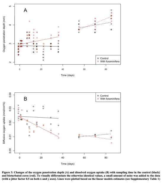 有孔蟲的運(yùn)動(dòng)行為通過(guò)增加氧氣滲透深度(OPD)和降低氧虧(DOU),顯著改變沉積物氧化還原狀態(tài)。