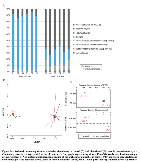細(xì)菌豐富度在0-5 mm層降低,硫酸鹽還原菌(如 Desulfatobacterales)在深層減少(圖5A)。古菌群落中,好氧的 Candidatus Nitrosopumilus 在表層富集(圖6A)。意義:氧氣滲透加深抑制了嚴(yán)格厭氧菌,凸顯有孔蟲作為"生態(tài)系統(tǒng)工程師"通過(guò)改變微生境調(diào)控微生物功能群。