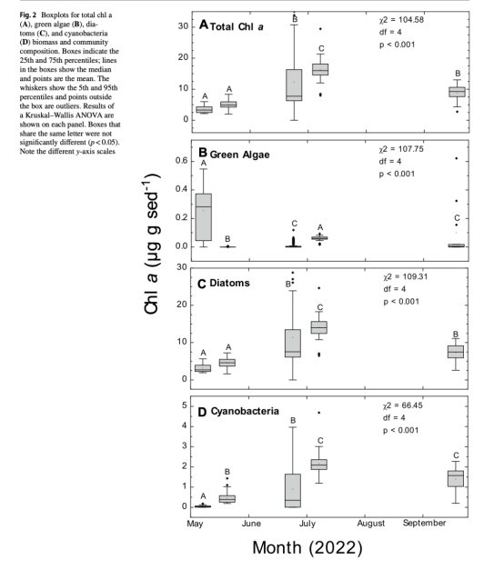 數據:攝食球與未攝食沉積物的葉綠素a無差異(p=0.15),但不同月份生物量差異顯著(p<0.001)。
