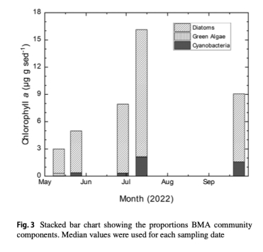 BMA動態:BMA生物量(葉綠素a)在6-7月達峰值(16 μg chl a g?1沉積物),群落以底棲硅藻為主(>80%),藍藻次之(圖2, 圖3)。