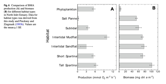 比較鹽沼洼地與其他河口生境(如潮間帶沙泥灘、 Spartina植被區)的BMA生產力差異。
