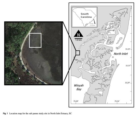 本研究首次量化了美國南卡羅來納州北灣河口(North Inlet Estuary)鹽沼洼地(supratidal salt panne)中底棲微藻(BMA)的生物量、群落組成、凈初級生產力(NPP)及招潮蟹(Leptuca pugilator)的攝食影響。關鍵發現包括: