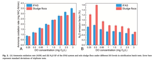 在DO=0.25-3 mg/L范圍內,IFAS系統的N2O排放因子(EF)比純懸浮污泥系統低50-83%。