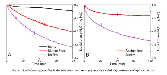 數據:添加N2O后,生物膜在120分鐘內消耗1.34 mg N/L N2O,而懸浮污泥僅消耗0.42 mg N/L。