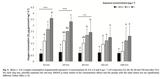 數據:10–40 nm nAg在≥2.5 μg/L時顯著增加耗氧量,而60–100 nm組無變化。