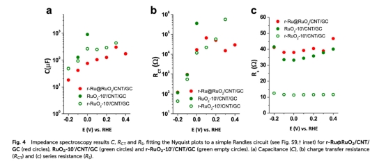 數(shù)據(jù):EIS顯示r-RuO?-10/CNT的串聯(lián)電阻(R?)比r-Ru@RuO?/CNT低4倍(圖4c),電荷轉(zhuǎn)移電阻(RcT)降低。