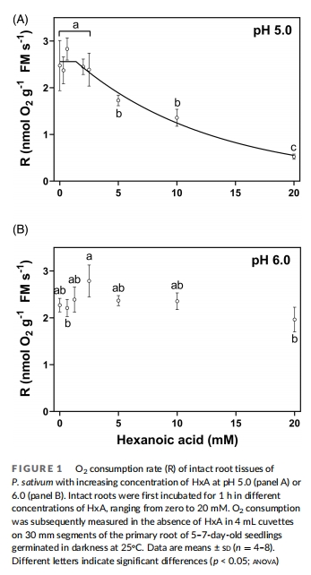 根系耗氧率 圖1 HxA濃度依賴性抑制呼吸(EC??=7.2 mM, pH 5.0),pH 6.0無顯著抑制。證明pH調(diào)控毒性。
