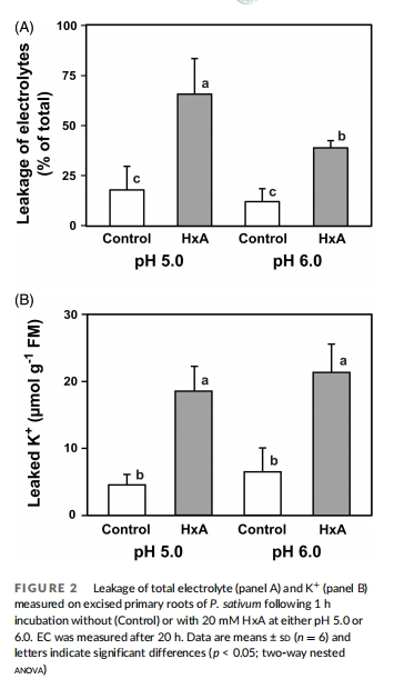 電解質(zhì)泄漏 圖2A HxA增加總電解質(zhì)滲出(pH 5.0 > pH 6.0),提示質(zhì)膜通透性改變。
