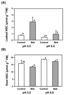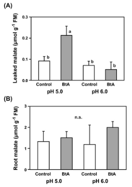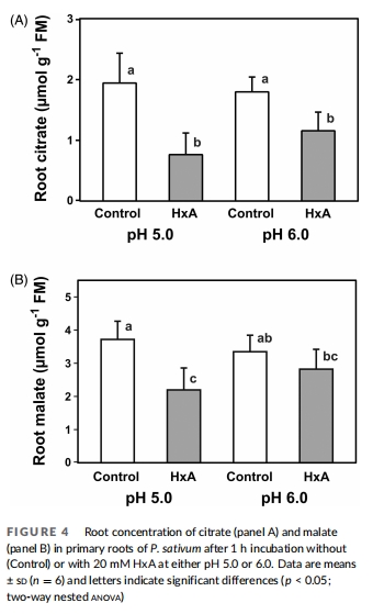 豌豆根在pH 5.0/6.0下暴露于20 mM HxA或BtA 1小時(圖1)。