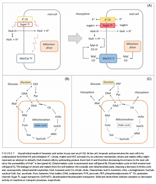 酸性條件下(pH 5.0),未解離的HxA進入細胞,觸發(fā)檸檬酸、蘋果酸和非結(jié)構(gòu)性碳水化合物(NSC)從根系滲出(圖3, 5),導(dǎo)致克雷布斯循環(huán)底物耗竭,從而限制線粒體呼吸。