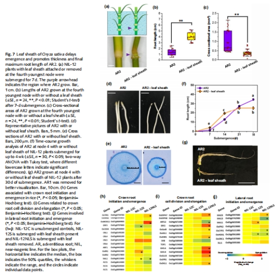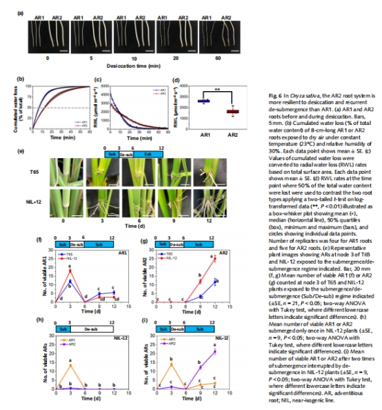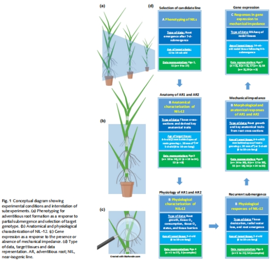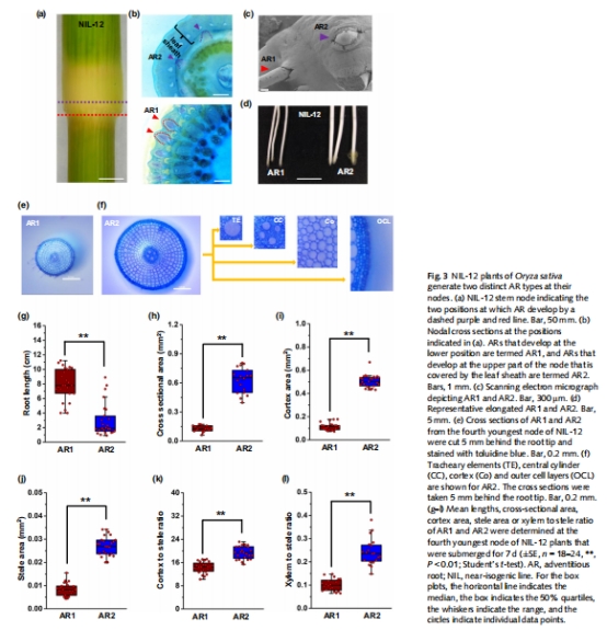 研究對象:深水稻(Oryza sativa)在洪水脅迫下形成兩種水生不定根(AR1和AR2)的遺傳與生理機制。