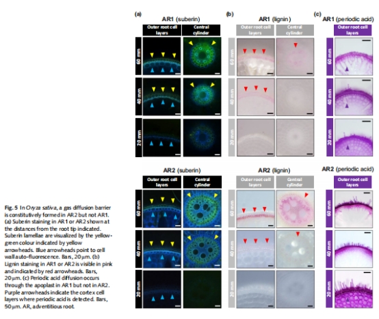 葉片鞘作用:葉片鞘的機械阻抗延遲AR2萌發,但促使其形成更粗的根系和更強的氧擴散屏障(圖5, 圖7)。