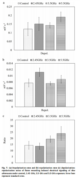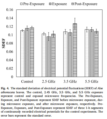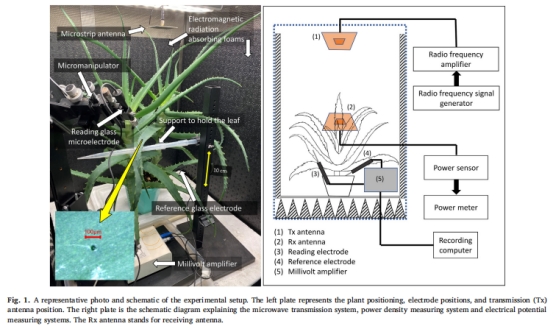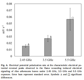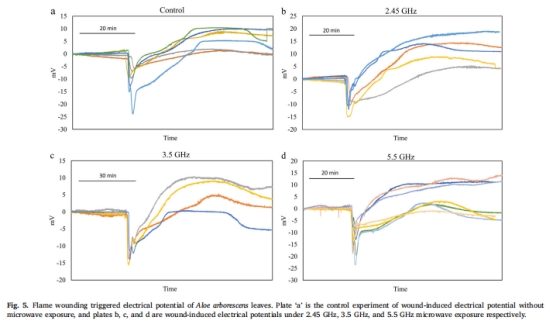 論文研究了2.45 GHz、3.5 GHz和5.5 GHz微波輻射(功率密度1.5±0.2 W/m2)對蘆薈(Aloe arborescens) 葉片損傷誘導(dǎo)電信號(Variation Potential, VP)的影響。研究發(fā)現(xiàn):